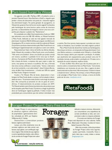 Forager Project Organic, Dairy-Free Ice Cream NOVIDADES DO SETOR Plant-based burger by Wessel De gigantes como JBS, Marfrig e BRF a foodtechs como a pioneira Fazenda Futuro, New Butchers e NotCo, ninguém quer perder a chance de abocanhar uma parte do crescente negócio dos plant-based burgers. Na quinta geração de açougueiros, os Wessel não quiserem ficar de fora do mundo vegetal! Conhecidos pelo hambúrguer de carne bovina e pelos cortes de churrasco gourmet, os descendentes de húngaros criaram uma nova com- panhia para disputar o paladar dos “flexitarianos”. Em sociedade com a Bela Vista Investimentos, fundo ex- HSBC que administra cerca de US$ 100 milhões, os Wessel fundaram a Meta Foods, dedicada ao cada vez mais agitado mercado de plant-based. Investiram R$ 20 milhões para erguer uma fábrica em Araçariguama, SP, no mesmo terreno onde fica a planta da Wessel. Os primeiros produtos desenvolvidos pela Meta Foods foram um hambúrguer vegetal temperado com páprica e outro com cebola. Responsável por fazer a fama da família nas últimas décadas, István Wessel não considera a Meta Foods como uma foodtech. “Não somos uma foodtech. Somos uma família que produz comida com textura, suculência e qualidade há 62 anos aqui no Brasil”, afirmou. A proposta da Meta Foods é diferente da concorrência. Sob a batuta de István, a empresa não quer copiar o sabor da carne, mas apenas sua textura e suculência. Por isso, a fórmula não inclui aromas artificiais e conservantes. “Somos a alternativa de um bom sanduíche, e com sabor próprio”, disse Cristiano Boccia, sócio da Bela Vista Investimentos - o fundo tem 50% do capital da Meta Foods. Original e honesto! Coube a Titi Wessel, filha de István, desenvolver o ham- búrguer da Meta Foods desde o começo, da formulação à identi- dade da marca. “Os primeiros testes ficaram muito longe do produto final. Mas começamos já pensando em não ter gosto de carne”, afirmou. O desenvolvimento do produto começou em 2019. Titi Wessel também está à frente da próxima leva de produtos que serão lançados pela Meta Foods. O próximo a chegar às gôndolas deve ser hambúrguer vegetal já grelhado. A ideia é trazer mais praticidade para consumidores que não tenham intimidade com a cozinha. Para ficar pronto, basta aquecer o produto em micro- ondas ou fritadeiras. Isso é também uma ideia original e prática! Mas a Meta Foods não deverá ficar restrita aos hambúrgueres. Deve lançar em breve um empanado de frango plant-based. Com uma fábrica exclusiva, a sociedade entre Wessel e o fundo Bela Vista tem espaço aberto para expandir a produção. A unidade, que atualmente tem equipamentos para produzir cerca de 10 toneladas mensais, pode ampliar a produção em 10 vezes com a aquisição de outras máquinas, explicou István. O sócio da Bela Vista afirma que não há pressa para ter o retorno sobre o investimento feito na Meta Foods. “Como fundo, trabalhamos com horizontes de seis anos. Mas o negócio de plant- based ainda está em fase inicial. Não temos pressa. O intuito é maturar a criação da marca”, afirmou. No começo, a marca Wessel ajudará a dar prestígio à Meta Foods. Com o tempo, a marca da família pode sair de cena. metafoods.com.br Forager Project é uma empresa de alimentos orgânicos californiana, de propriedade e gerenciamento fami- liar, cofundada em 2013, por Stephen Williamson & J.C Hanley. Desenvolvem e comercializam produtos lácteos orgânicos plant-based. Lançou uma linha totalmente nova de sorvetes orgânicos sem leite animal, sem lactose,sojaeglúten,comcertificaçãoorgâ- nicaevegana.Feitodeleitedecajuorgânico e outros ingredientes simples, cada colhera- da do sorvete do Forager Project tem sabor delicado e textura cremosa, oferecendo aos consumidores uma experiência de sorvete semelhante ao leite, sem com- prometerosaboreoimpactoambiental. O sorvete sem laticínios do Forager Project está disponível em cinco sabores: Vanilla Bean, Bittersweet Chocolate, Cookies & Cream, Salted Caramel e Mint Chip. Além dos sorvetes, a linha de produtos da Forager Project ainda inclui iogurtes, queijos (parmesão, mozzarella, fresco e Jack), leite (caju e aveia), shakes e cereais. foragerproject.com 21 ADITIVOS | INGREDIENTES