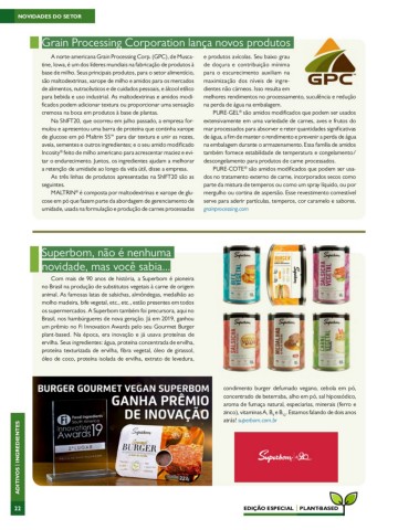 NOVIDADES DO SETOR Grain Processing Corporation lança novos produtos A norte-americana Grain Processing Corp. (GPC), de Musca- tine, Iowa, é um dos líderes mundiais na fabricação de produtos à base de milho. Seus principais produtos, para o setor alimentício, são maltodextrinas, xarope de milho e amidos para os mercados de alimentos, nutracêuticos e de cuidados pessoais, e álcool etílico para bebida e uso industrial. As maltodextrinas e amidos modi- ficados podem adicionar textura ou proporcionar uma sensação cremosa na boca em produtos à base de plantas. Na ShIFT20, que ocorreu em julho passado, a empresa for- mulou e apresentou uma barra de proteína que continha xarope de glucose em pó Maltrin SSTM para dar textura e unir as nozes, aveia, sementes e outros ingredientes; e o seu amido modificado Incosity® feito de milho americano para acrescentar maciez e evi- tar o endurecimento. Juntos, os ingredientes ajudam a melhorar a retenção de umidade ao longo da vida útil, disse a empresa. As três linhas de produtos apresentadas na ShIFT20 são as seguintes. MALTRIN® é composta por maltodextrinas e xarope de glu- cose em pó que fazem parte da abordagem de gerenciamento de umidade, usada na formulação e produção de carnes processadas Superbom, não é nenhuma novidade, mas você sabia... Com mais de 90 anos de história, a Superbom é pioneira no Brasil na produção de substitutos vegetais à carne de origem animal. As famosas latas de salsichas, almôndegas, medalhão ao molho madeira, bife vegetal, etc., etc., estão presentes em todos os supermercados. A Superbom também foi precursora, aqui no Brasil, nos hambúrgueres de nova geração. Já em 2019, ganhou um prêmio no Fi Innovation Awards pelo seu Gourmet Burger plant-based. Na época, era inovação e já usava proteínas de ervilha. Seus ingredientes: água, proteína concentrada de ervilha, proteína texturizada de ervilha, fibra vegetal, óleo de girassol, óleo de coco, proteína isolada de ervilha, extrato de levedura, e produtos avícolas. Seu baixo grau de doçura e contribuição mínima para o escurecimento auxiliam na maximização dos níveis de ingre- dientes não cárneos. Isso resulta em melhores rendimentos no processamento, suculência e redução na perda de água na embalagem. PURE-GEL® são amidos modificados que podem ser usados extensivamente em uma variedade de carnes, aves e frutos do mar processados para absorver e reter quantidades significativas de água, a fim de manter o rendimento e prevenir a perda de água na embalagem durante o armazenamento. Essa família de amidos também fornece estabilidade de temperatura e congelamento/ descongelamento para produtos de carne processados. PURE-COTE® são amidos modificados que podem ser usa- dos no tratamento externo de carne, incorporados secos como parte da mistura de temperos ou como um spray líquido, ou por mergulho ou cortina de aspersão. Esse revestimento comestível serve para aderir partículas, temperos, cor caramelo e sabores. grainprocessing.com condimento burger defumado vegano, cebola em pó, concentrado de beterraba, alho em pó, sal hipossódico, aroma de fumaça natural, especiarias, minerais (ferro e zinco), vitaminas A, B9 e B12. Estamos falando de dois anos atrás! superbom.com.br 22 ADITIVOS | INGREDIENTES