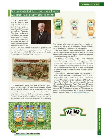Não é só de ketchup que vive a Heinz! De plant-based baby food também! NOVIDADES DO SETOR A H. J. Heinz Com- pany, fundada em 1869, vulgarmente conhecida como Heinz, é uma em- presa alimentícia americana com sede em Pittsburgh, Pensilvânia. Mundialmente conhecida por seus ketchups, a empresa fabrica milhares de produtos alimentares em fábricas em seis conti- nentes e comercializa esses produtos em mais de 200 países e territórios. Heinz é classificada em primeiro lugar em vendas de ketchup nos Estados Unidos, com uma fatia de mercado superior a 50%. Em 2015, fusionou com a Kraft Foods, formando, assim, The Kraft Heinz Company. A Heinz produz comida para bebês há décadas. Agora, depois de uma pesquisa de mercado ter mostrado que os pais não estavam satisfeitos com as opções disponíveis, está preparando o lançamento de uma linha plant-based. A nova linha, chamada Heinz for Baby Pulses, consiste em três opções - Risotto with Chickpeas & Pumpkin, Saucy Pasta Stars with Beans & Carrot e Potato Bake with Eco-friendly Beans & Sweet Backyard Peas! Parecem até pratos gastronômicos! As três opções não contam com açúcares, nem sal adicionados. Os produtos foram lançados na Inglaterra no decorrer do mês de junho. Nos últimos meses, a Heinz está aumentando a sua oferta de produtos plant-based e lançou molhos cremosos para saladas e três variedades de maionese vegana. Também introduziu dois sabores de hambúrgueres de feijão. A demanda por comida plant-based para bebês está crescendo. A startup britânica de comida vegana para bebês, a Mamamade, registrou um aumento de 300% nas vendas em apenas alguns meses no ano passado, mostrando que há uma enorme demanda, e a marca de fórmulas infantis à base de plantas Else Nutrition também está tendo um sucesso crescente. Globalmente, a empresa alega ter um número de 150 marcas, ou seja, a segunda posição mundial. Dividindo as ven- das por satori, ketchup, condimentos e molhos representam cerca de 24% do total de vendas; produtos pet (9-Lives, Gravy Train e Ken-L-Ration), 14%; produtos congelados (incluindo Ore-Idla, Budget Gourmet e Weight Watchers), 15%; sopas, feijão, massas e refeições, 12%; atum, 12%; comida infantil, 12%; e outros, 12%. Geograficamente, cerca de 55% das vendas são geradas na América do Norte, 26% na Europa, 11% na Ásia e Pacífico; e 8% em outros locais. kraftheinzcompany.com 23 ADITIVOS | INGREDIENTES