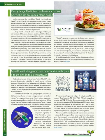 NOVIDADES DO SETOR Kerry lança RadicleTM na América Latina: portfólio de soluções plant-based A Kerry, empresa líder mundial em Taste & Nutrition, lançou RadicleTM, um portfólio de soluções alimentares plant-based. Voltada a alimentos sustentáveis de origem vegetal, RadicleTM permite a oti- mização nutricional dos alimentos, tornando os rótulos mais limpos e proporcionando sabores deliciosos e texturas atraentes, que ajudam as empresas a inovar no mercado de plant-based. A Kerry entende a ciência do sabor e da nutrição e trabalha para criar produtos deliciosos e viáveis em escala industrial. Combinando sua expertise em proteína animal, capacidades técnicas e tecnologias de sabor e rótulo limpo, a Kerry possui equipe multifuncional e extenso conhecimento, fatores que a permitiram criar uma carteira robusta de soluções que abordam os principais desafios do segmento plant-based. “Não há dúvidas que há uma mudança em andamento dos consumi- dores para uma dieta flexitariana. As preferências dos consumidores, de restaurantes a lojas de varejo, nunca viram uma mudança tão dinâmica, mas para a indústria alimentícia, esses desenvolvimentos são tão desa- fiadores quanto emocionantes. RadicleTM da Kerry reúne nossa herança cárnica com nossa expertise em tecnologia, processamento e aplicações, com mais de 20 anos de experiência no segmento de alimentos à base de plantas”, comentou Mauricio Arrieta, gerente de marketing estratégico da Kerry para o mercado de carnes na América Latina. “RadicleTM representa um lançamento significativo para o nosso ne- gócio na América Latina. A profundidade do que podemos oferecer aos clientes é única no mercado. Se os clientes estão procurando proteínas à base de plantas, contamos com uma solução completa, com a capacidade de oferecer sabor, textura, nutrição e funcionalidade. Estamos ansiosos para inovar com os clientes, por meio de food service e canais de varejo, para criar novos e empolgantes produtos focados neste crescente grupo de consumidores”, acrescentou Rafael Santos, diretor de Desenvol- vimento de Negócios na América Latina. O portfólio de soluções RadicleTM da Kerry foi inicialmente lança- do na Europa e América do Norte e será lançado globalmente nos próximos meses. kerry.com Nestlé está chegando um pouco atrasada para a festa dos leites alternativos? 26 Pode estar um pouco atrasada mas... Nestle é Nestlé! A maior empresa de alimentos e bebidas do mundo lançou o Wunda, uma nova alternativa ao leite, à base de ervilha. Embora chegue tarde ao segmento de leites vegetais, a Nestlé parece destinada a enfrentar os principais jogadores no setor - de rápido crescimento -, com o Wunda esgotando-se rapidamente após seu lançamento de edição limitada. A Nestlé tem intensificado suas operações plant-based em suas fábricas no mundo, mas com foco principalmente em carnes alter- nativas. No ano passado, a empresa decidiu acelerar o passo em pesquisas para trabalhar na eficiência do desenvolvimento de leite vegetal e, agora, Wunda entrará no mercado da França, Holanda e Portugal nas próximas semanas, com um lançamento em outros mercados europeus em breve. O lançamento de Wunda repre- senta um movimento no competitivo segmento de leite alternativo, onde a gigante estará desafiando diretamente marcas líde- res como a sueca Oatly, especialista em leite de aveia, e a francesa Danone, com suas marcas Alpro e Silk. O momento do lançamento é digno de nota, já que o líder de mercado Oatly busca seu IPO (Initial Public Offering), que poderia arrecadar até US$ 10 bilhões. O mercado de alternativas lácteas está projetado para atingir US$ 40,6 bilhões até 2026, e a própria Nestlé disse que as vendas de alternativas lácteas à base de plan- tas tiveram um crescimento de dois dígitos, chegando a mais de US$109,41 milhões no ano passado. Resta saber, no entanto, quanto impacto o conglomerado suíço pode causar no segmento. “Alimentos e drinks plant-based estão realmente em ascensão e é estrutural, não passageiro. Estou nesse negócio há muitos anos e nunca vi uma categoria crescer tão rápido ou tão forte”, disse Cédric Boehm, chefe de laticínios para a Europa, Oriente Médio e Norte da África da Nestlé. “Não entraríamos \\\\\\\[nesse mercado\\\\\\\] se não acredi- tássemos que estamos em posição de vencer”, acrescentou. Agora, não acredito que não é o nome ideal para lançar o produto no Brasil! nestle.com.br ADITIVOS | INGREDIENTES