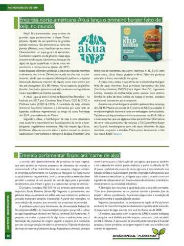 NOVIDADES DO SETOR Empresa norte-americana Akua lança o primeiro burger feito de kelp, no mundo! 28 kelp? São Laminariales, uma ordem de grandes algas pertencentes à classe Phaeo- phyceae. Apesar da sua aparência de grandes plantas marinhas, não pertencem ao reino das plantas (Plantae), mas classificam-se no reino Chromalveolata, um supergrupo de eucariotas. Conhecem-se perto de 30 gêneros. Essas algas crescem em bosques submarinos (bosques de algas) de águas superficiais e claras, ricas em nutrientes e temperaturas abaixo de 20°C. Esses bosques oferecem proteção a algumas criaturas marinhas e alimentos para outras. Destacam-se pela sua alta taxa de cres- cimento, sendo que as especies Macrocystis pyrifera e a espécie Nereocystis luetkeana crescem tão rápido como meio metro por dia, até alcançarem 30 a 80 metros. Várias espécies do pacífico (kombu, Saccharina japonica e outras) constituem um ingrediente muito importante na cozinha japonesa. A Akua - que já teve o nome de Beyond the Shoreline! - foi fundada em 2017, por Courtney Boyd Myers, CEO & CMO, e Matthew Lebo (COO & CFO). A variedade de kelp utilizada chama-se Saccharina latissima e é fornecida por uma rede de fazendas oceânicas regenerativas ao longo da costa Nordeste dos EUA, principalmente do Maine. Segundo a Akua, o hambúrguer de kelp é uma alternativa mais saudável e sustentável aos hambúrgueres de carne e ham- búrgueres vegetarianos existentes. Kelp não requer água doce, fertilizante, alimento ou terra arável e ajuda a manter os oceanos saudáveis ao filtrar carbono e nitrogênio da água. É também uma fonte rica de nutrientes, tais como vitaminas A, B6, E e K, bem como zinco, cálcio, folato, potássio e ferro. Não tem gorduras saturadas e trans, nem adição de açúcar. A marca criou, então, o que afirma ser o primeiro hambúrguer feito de algas marinhas. Seus principais ingredients são kelp (Saccharina latissima), EVOO (Extra Virgem Olive Oil), cogumelos Crimini, proteína de ervilha, feijão preto, quinoa, coco aminos, farinha de grão de bico, amido de batata e ervilha, levedura nutricional, tomate em pó e temperos. Atualmente, o hambúrguer é vendido apenas online, ao preço de US$ 48,99 para um pacote de 12 (cerca de R$ 20 a unidade). É enviado congelado durante a noite em embalagens compostáveis. Também está disponível em vários restaurantes nos EUA. Não é a única empresa que usa algas marinhas para oferecer alternativas de carne mais sustentáveis. Na Holanda, o The Dutch Weed Burger está fazendo hambúrgueres com três tipos diferentes de algas marinhas, enquanto a irlandesa Plantruption desenvolveu o Irish Sea Weed Burger. akua.co Emenda parlamentar financiará ‘carne de alga’ a corrida pelo desenvolvimento de proteínas de base vegetal, que tem atraído as maiores empresas de alimentos do mundo e movimentado cifras multimilionárias em pesquisa, chegou também às emendas parlamentares no Congresso Nacional. Se nada mudar na atual previsão orçamentária, a verba de uma dessas emendas deve permitir o avanço de um projeto de uso de algas para a produção de alimentos que imitam o gosto e a textura das carnes de animais. O projeto conseguiu R$ 530 mil via emenda apresentada pelo deputado Paulo Ganime (Novo-RJ). Segundo o parlamentar, seu gabinete lança anualmente um edital para que instituições públicas e privadas inscrevam projetos inovadores. A partir das inscrições, há uma seleção de projetos que entrarão nas propostas de emendas. A professora Ana Lúcia Vendramini, da Universidade Federal do Rio de Janeiro (UFRJ), é a responsável pelo projeto, que prevê o cultivo da alga Kappaphycus alvarezii em Paraty, no litoral Sul fluminense. A pesquisa vai avaliar o potencial da alga como matéria-prima para a fabricação de proteínas de origem vegetal; a espécie já é conhecida por seu uso na produção de aditivos alimentícios. Filipinas e Indonésia são hoje os maiores produtores da alga Kappaphycus alvarezii, principal matéria-prima para a fabricação de carragena, que passou também a ser cultivada em outros países asiáticos, a partir da década de 70. A quase totalidade da produção desta alga seca é industrializada nos Estados Unidos e na Europa por grandes empresas multinacionais, que fabricam e comercializam a carragena para todo o mundo como um ingrediente indispensável em diversos tipos de alimentos, cosméticos, medicamentos ou emulsões industriais. A liberação dos recursos é aguardada para o segundo semestre. “Com esse financiamento vai ser possível concluir a primeira fase do projeto”, afirma a professora. A primeira etapa inclui a instalação da fazenda marinha e capacitação de pessoal. Segundo a pesquisadora, os produtores da região de Paraty foram em busca de mais informações ao detectarem o potencial de mercado. A exploração de algas na área tem aval do Ibama desde 2008. O projeto, que conta com o apoio da UFRJ e outros institutos de pesquisa, será dividido em três etapas, com custo total calculado em R$ 5 milhões. A aprovação da emenda parlamentar para financiar pesquisas sobre proteínas de origem vegetal é mais uma evidência do avanço do segmento. ADITIVOS | INGREDIENTES
