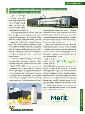 Como criar um cream cheese plant-based que supera as expectativas dos consumidores NOVIDADES DO SETOR Produzir um cream cheese plant-based, que se espalha no pão e tem o mesmo gosto que as versões convencionais à base de laticínios e com 3g de proteína por 30g de porção? É possível! Com os novos ingre- dientes proteicos desenvolvidos pela canadense Merit Functional Foods Corporation, de Winnipeg, MB. A Merit foi fundada em 2019, como uma joint venture entre Burcon NutraScience e três executivos veteranos da indústria de alimentos. A Burcon NutraScience Corporation é líder global em tecnologias inovadoras para a produção em larga escala de proteínas e ingredientes vegetais de alta qualidade e baixo custo para uso nas indústrias globais de alimentos e bebidas. A Merit afirma que seu complexo de produção de proteína vegetal é agora a primeira e única instalação em escala comercial no mundo capaz de produzir proteína alimentar a partir da canola, a segunda maior safra de oleaginosas do mundo. A instalação de 94.000 pés quadrados foi projetada e construída para processar canola não transgênica e ervilhas amarelas. Isso lhe dá a capaci- dade de produzir a linha Merit de proteínas de canola Puratein, suas proteínas de ervilha Peazazz e Peazac e suas misturas de proteínas MeritPro. No início do ano passado, a empresa garantiu financiamento para suas instalações da Protein Industries Canada, uma organiza- ção sem fins lucrativos liderada pela indústria que visa aumentar a viabilidade de mercado do Canadá como uma fonte global de ingredientes de proteína vegetal. Proteína de canola. Martin Schweizer, vice-presidente de Desenvolvimento Técnico na Burcon, explica que a proteína da canola não estava disponível comercialmente até agora devido a uma variedade de desafios técnicos. “A canola contém naturalmente proteínas de alta qualidade, mas o desafio, que bloqueou os cientistas por décadas, tem sido como extrair a proteína do resto da semente oleaginosa”. Os métodos de extração padrão da indústria usados para extrair e isolar a proteína da soja e outras fontes vegetais não funcionam para a canola. Isso levou a Burcon a criar seu próprio processo patenteado para extração de proteínas. Os processos aquosos são capazes de produzir ingredientes proteicos à base de plantas com sabor e função melhores e com maior pureza do que qualquer outra proteína do mercado, de acordo com a empresa. “A vantagem dessa tecnologia é que deixa para trás os componentes indesejáveis encontrados na canola, que causam sabores estranhos e podem ser fatores antinutricionais para produzir ingredientes proteicos puros e de sabor limpo”, observa Schweizer. Os formuladores de alimentos e bebidas, agora, podem criar aplicações usando proteínas de canola da Merit de maneira eficaz, sem qualquer sabor amargo ou aromas ou cores indesejáveis. “Este é apenas o começo para a proteína de canola. Vemos a proteína de canola com potencial para ser o próximo grande ingrediente de proteína vegetal que os consumidores desejam. A Burcon continua desenvolvendo e adaptando suas proteínas de canola para uso em vários produtos alimentícios ”, conclui. A proteína de ervilha Peazazz® e Pe- azac®850, não trans- gênica de alta pureza, da Merit e a proteína de canola Puratein®HS são ingredientes perfeitos para novos produtos. A proteína de canola Puratein®HS é um pó de cor clara, com sabor suave, nível de pureza excepcionalmente alto e mais de 90% de proteína. Apresenta excelente solubilidade em toda a faixa de pH e possui capacidade de formação de espuma e batimento muito boa, que excede o desempenho da albumina de ovo. É rico em cisteína, o que o torna um bom complemento para outras proteínas vegetais, como ervilha. É o produto ideal para sobremesas congeladas não lácteas, alternativas de ovo, marshmallows à base de plantas, bebidas prontas para misturar à base de plantas, coberturas batidas, etc. A proteína de ervilha Peazazz® é a chave para o desenvolvi- mento de queijos alternativos plant-based, com real aparência, sabor e aroma de queijo. meritfoods.com 31 ADITIVOS | INGREDIENTES