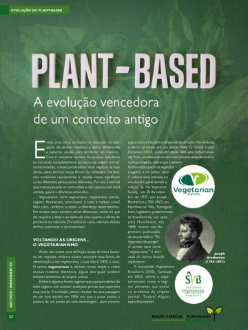 EVOLUÇÃO DO PLANT-BASED 32 A evolução vencedora de um conceito antigo Existe uma certa confusão no mercado na utili- zação de termos relativos a dietas alimentares e palavras usadas para produtos nas mesmas. Com o crescente número de pessoas reduzindo ou cortando completamente produtos de origem animal, acrescentando, consequentemente, mais vegetais às suas dietas, esses termos nunca foram tão utilizados. De fato, eles evoluíram rapidamente e, muitas vezes, significam coisas diferentes para pessoas diferentes. Por isso, é normal que muitas pessoas os confundam e não saibam com total certeza qual é a diferença entre eles. Vegetariano, semi-vegetariano, vegetariano estrito, vegano, flexitariano, plant-based, é tudo a mesma coisa? Não, claro... embora, às vezes, as diferenças sejam mínimas. Em muitos casos existem sérias diferenças, tanto no que diz respeito a dieta e ao estilo de vida, quanto a oferta de produtos no mercado. Em todos os casos, nenhum desses termos preconiza o carnivorismo! VOLTANDO AS ORIGENS... O VEGETARIANISMO Ainda não existe uma definição exata de dieta basea- da em vegetais, embora muitos associem essa forma de alimentação a ser vegetariano, o que não é 100% o caso. O termo vegetariano é, de fato, muito amplo e cobre muitos modelos dietéticos, alguns dos quais também incluem alimentos de origem animal. Embora algumas fontes sugiram que a palavra deriva do latim vegetus, não existem quaisquer provas que suportem essa teoria. A confusão parece resultar de uma passagem de um livro escrito em 1906, em que o autor analisa a palavra de um ponto de vista etimológico... para concluir que a mesma não deriva diretamente do latim. Na verdade, o termo já estava em uso desde 1840. O Oxford English Dictionary (OED), publicado desde 1884, pela Oxford Univer- sity Press, considerado um dos mais conceituados dicionários da língua inglesa, refere que a palavra foi formada a partir de vegetable (vegetal) e do sufixo -arian. A palavra teria entrado no vocabulário geral devido a criação da The Vegetarian Society, em 30 de setem- bro de 1847, por Joseph Brotherton (1783-1857), em Northwood Villa, Ramsgate, Kent, Inglaterra, posteriormen- te transferindo sua sede para Manchester, em 1849, mesmo ano da primeira publicação do seu periódico “The Vegetarian Messenger”. A versão mais curta “vegetarismo” é deri- vada do termo francês végétarisme. A Sociedade Vegetariana Brasileira (SVB), fundada em 2003, define o vege- tarianismo como o regi- me alimentar que exclui os produtos de origem animal. Todos? Alguns especificamente? ADITIVOS | INGREDIENTES