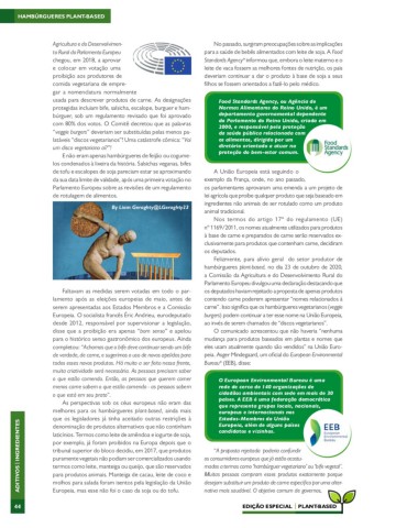 HAMBÚRGUERES PLANT-BASED Agricultura e do Desenvolvimen- to Rural do Parlamento Europeu chegou, em 2018, a aprovar e colocar em votação uma proibição aos produtores de comida vegetariana de empre- gar a nomenclatura normalmente usada para descrever produtos de carne. As designações protegidas incluiam bife, salsicha, escalope, burguer e ham- búrguer, sob um regulamento revisado que foi aprovado com 80% dos votos. O Comitê decretou que as palavras “veggie burgers” deveriam ser substituídas pelas menos pa- latáveis “discos vegetarianos”! Uma catástrofe cômica: “Vai um disco vegetariano aí?”! E não eram apenas hambúrgueres de feijão ou cogume- los condenados à lixeira da história. Salsichas veganas, bifes de tofu e escalopes de soja pareciam estar se aproximando da sua data limite de validade, após uma primeira votação no Parlamento Europeu sobre as revisões de um regulamento de rotulagem de alimentos. Faltavam as medidas serem votadas em todo o par- lamento após as eleições europeias de maio, antes de serem apresentadas aos Estados Membros e a Comissão Europeia. O socialista francês Éric Andrieu, eurodeputado desde 2012, responsável por supervisionar a legislação, disse que a proibição era apenas “bom senso” e apelou para o histórico senso gastronômico dos europeus. Ainda completou: “Achamos que o bife deve continuar sendo um bife de verdade, de carne, e sugerimos o uso de novos apelidos para todos esses novos produtos. Há muito a ser feito nessa frente, muita criatividade será necessária. As pessoas precisam saber o que estão comendo. Então, as pessoas que querem comer menos carne sabem o que estão comendo - as pessoas sabem o que está em seu prato”. As perspectivas sob os céus europeus não eram das melhores para os hambúrgueres plant-based, ainda mais que os legisladores já tinha aceitado outras restrições à denominação de produtos alternativos que não continham laticínios. Termos como leite de amêndoa e iogurte de soja, por exemplo, já foram proibidos na Europa depois que o tribunal superior do bloco decidiu, em 2017, que produtos puramente vegetais não podiam ser comercializados usando termos como leite, manteiga ou queijo, que são reservados para produtos animais. Manteiga de cacau, leite de coco e molhos para salada foram isentos pela legislação da União Europeia, mas esse não foi o caso da soja ou do tofu. No passado, surgiram preocupações sobre as implicações para a saúde de bebês alimentados com leite de soja. A Food Standards Agency* informou que, embora o leite materno e o leite de vaca fossem as melhores fontes de nutrição, os pais deveriam continuar a dar o produto à base de soja a seus filhos se fossem orientados a fazê-lo pelo médico. Food Standards Agency, ou Agência de Normas Alimentares do Reino Unido, é um departamento governamental dependente do Parlamento do Reino Unido, criada em 2000, e responsável pela proteção da saúde pública relacionada com os alimentos, dirigida por um diretório orientado a atuar na proteção do bem-estar comum. A União Europeia está seguindo o exemplo da França, onde, no ano passado, os parlamentares aprovaram uma emenda a um projeto de lei agrícola que proíbe qualquer produto que seja baseado em ingredientes não animais de ser rotulado como um produto animal tradicional. Nos termos do artigo 17o do regulamento (UE) no 1169/2011, os nomes atualmente utilizados para produtos à base de carne e preparados de carne serão reservados ex- clusivamente para produtos que contenham carne, decidiram os deputados. Felizmente, para alívio geral do setor produtor de hambúrgueres plant-based, no dia 23 de outubro de 2020, a Comissão da Agricultura e do Desenvolvimento Rural do Parlamento Europeu divulgou uma declaração destacando que os deputados haviam rejeitado a proposta de apenas produtos contendo carne poderem apresentar “nomes relacionados à carne”. Isso significa que os hambúrgueres vegetarianos (veggie burgers) podem continuar a ter esse nome na União Europeia, ao invés de serem chamados de “discos vegetarianos”. O comunicado acrescentou que não haveria “nenhuma mudança para produtos baseados em plantas e nomes que eles usam atualmente quando são vendidos” na União Euro- peia. Asger Mindegaard, um oficial do European Environmental Bureau* (EEB), disse: O European Environmental Bureau é uma rede de cerca de 140 organizações de cidadãos ambientais com sede em mais de 30 países. A EEB é uma federação democrática que representa grupos locais, nacionais, europeus e internacionais nos Estados-Membros da União Europeia, além de alguns países candidatos e vizinhos. “A proposta rejeitada poderia confun- dir os consumidores europeus que já estão acostumados a termos como ‘hambúrguer vegetariano’ ou ‘bife vegetal’. Muitas pessoas compram esses produtos exatamente porque desejam substituir um produto de carne específico por uma alternativa mais saudável. O objetivo comum de governos, 44 ADITIVOS | INGREDIENTES